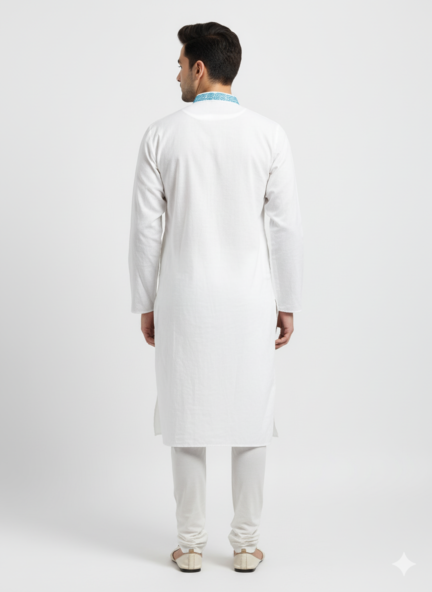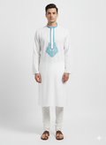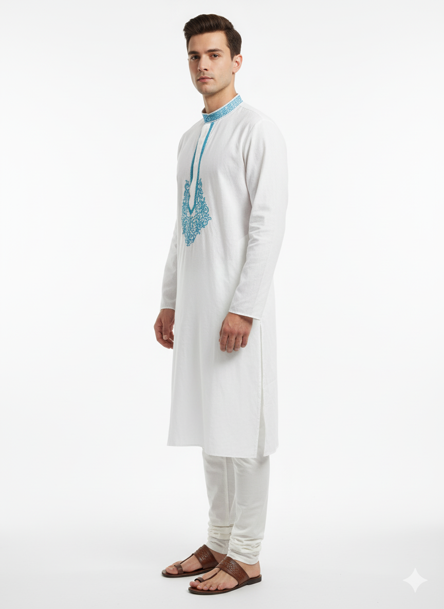 This white kurta for men features intricate royal blue embroidery, blending traditional craftsmanship with contemporary style. Made from breathable fabric, it offers comfort for extended wear, making it ideal for festive occasions and formal gatherings. The detailed embroidery enhances its elegance, providing a distinguished and refined look.